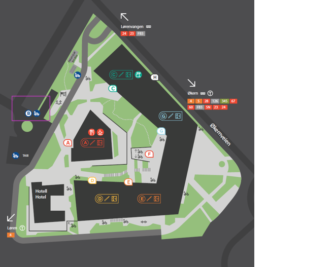 - Nærmeste busstopp er Lørenvangen. Her går buss nr. 23 og 24.